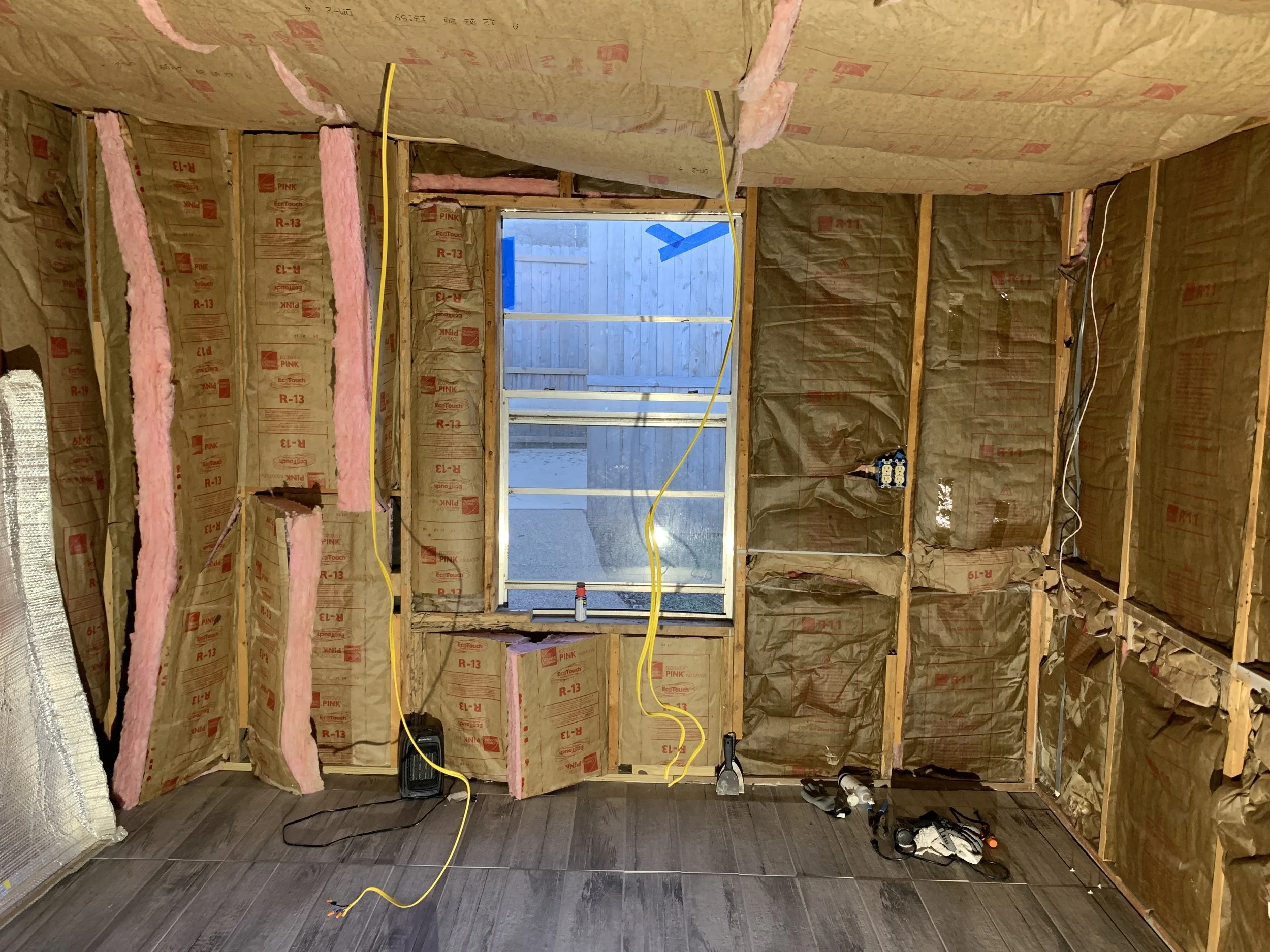 Rehab: $11,000. This included gutting the entire inside of the building, replacing both windows, all new insulation, leveling the floor, installing wood plank ceiling, walls, new electric, and LED lighting around the ceiling trim.
